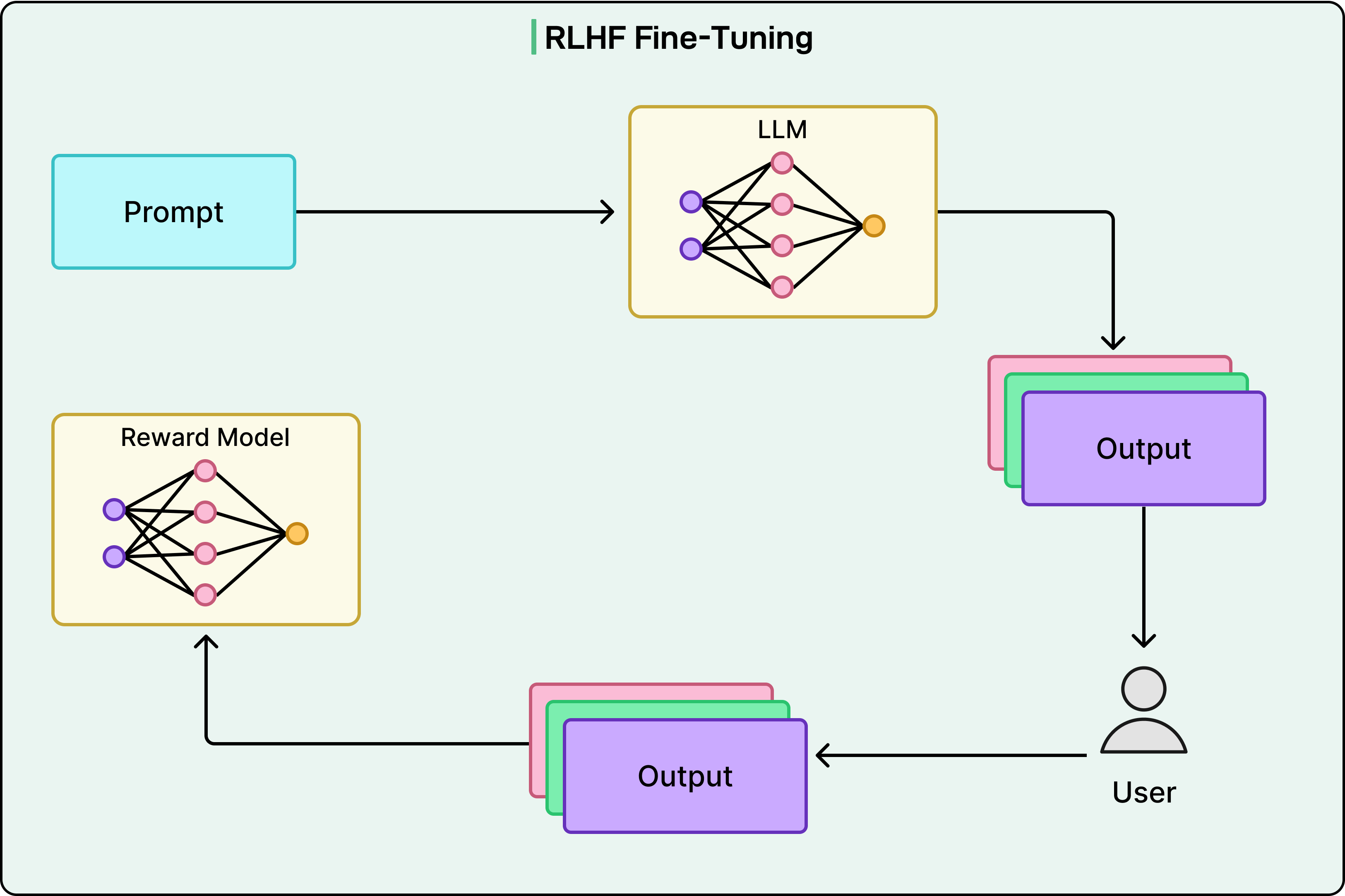 Once the reward model exists, it guides further training of the language model. The language model generates responses, the reward model scores them, and the language model updates to produce higher-scoring responses.