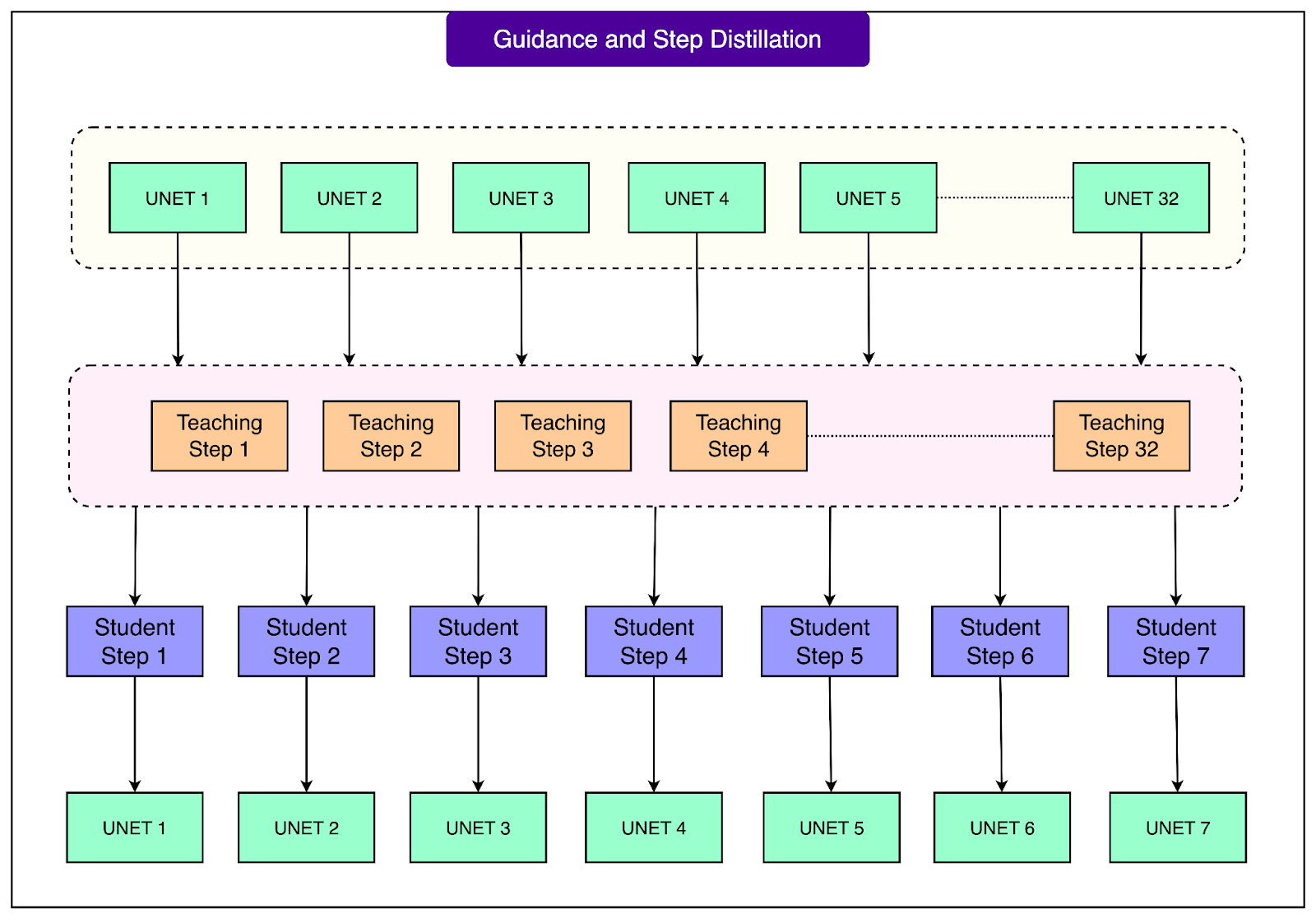 Step distillation: Training a smaller “student” model to compress multiple steps of the larger “teacher” model into fewer steps.