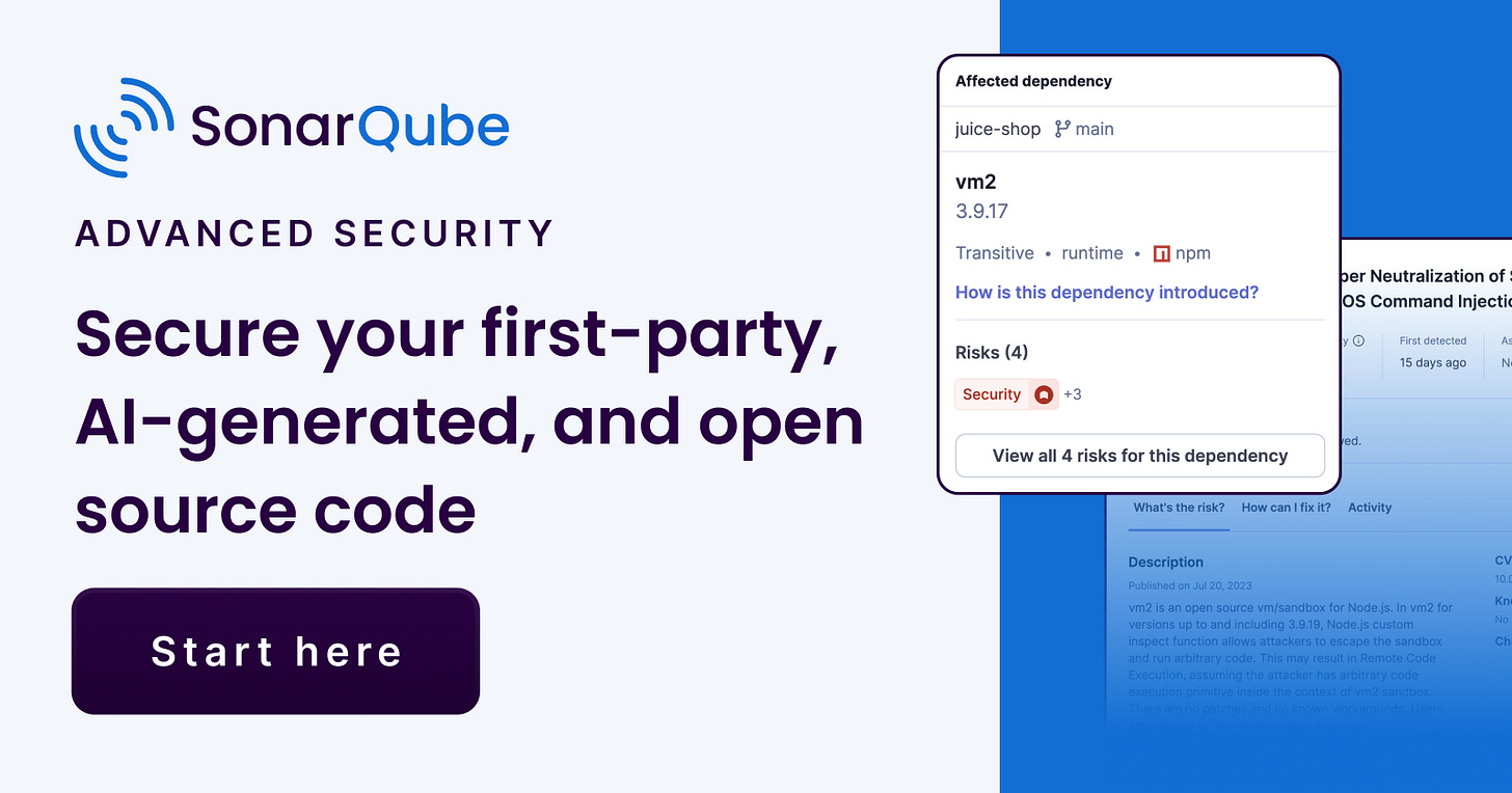 Ready to embrace secure coding without slowing down? SonarQube Advanced Security helps you find and fix quality and security issues across your entire codebase—from first-party and AI-generated code to your open source dependencies.