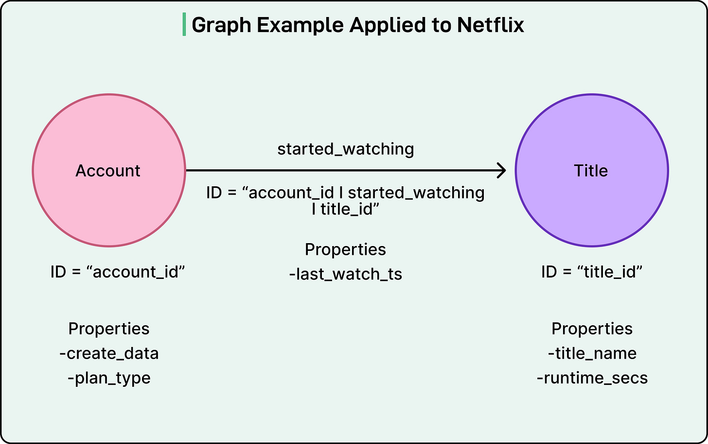 When a member watches a particular show, the system might create an account node with properties like creation date and plan type, a title node with properties like title name and runtime, and a started watching edge connecting them with properties like the last watch timestamp.