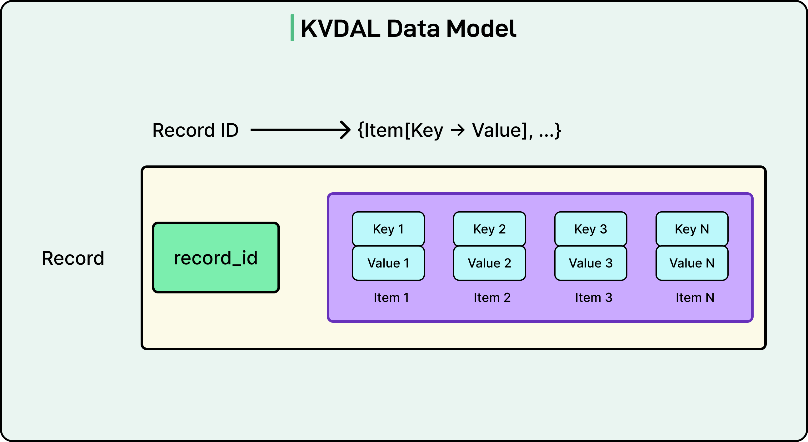 KVDAL uses a two-level map architecture. Data is organized into records uniquely identified by a record ID. Each record contains sorted items, where an item is a key-value pair. To query KVDAL, you look up a record by ID, then optionally filter items by their keys. This gives both efficient point lookups and flexible retrieval of related data.