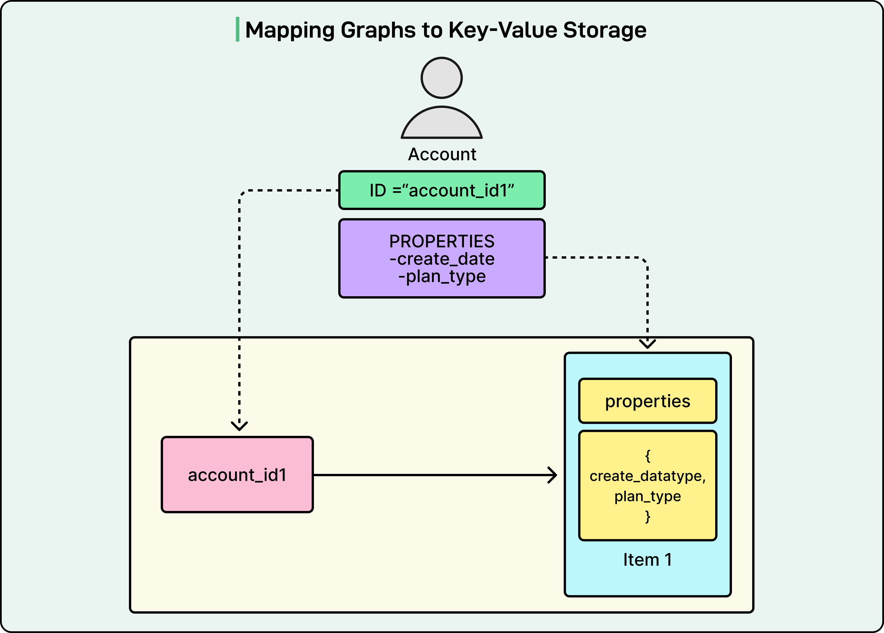 For nodes, the unique identifier becomes the record ID, with all properties stored as a single item. For edges, Netflix uses adjacency lists. The record ID represents the origin node, while items represent all destination nodes it connects to. If an account has watched multiple titles, the adjacency list contains one item per title with properties like timestamps.