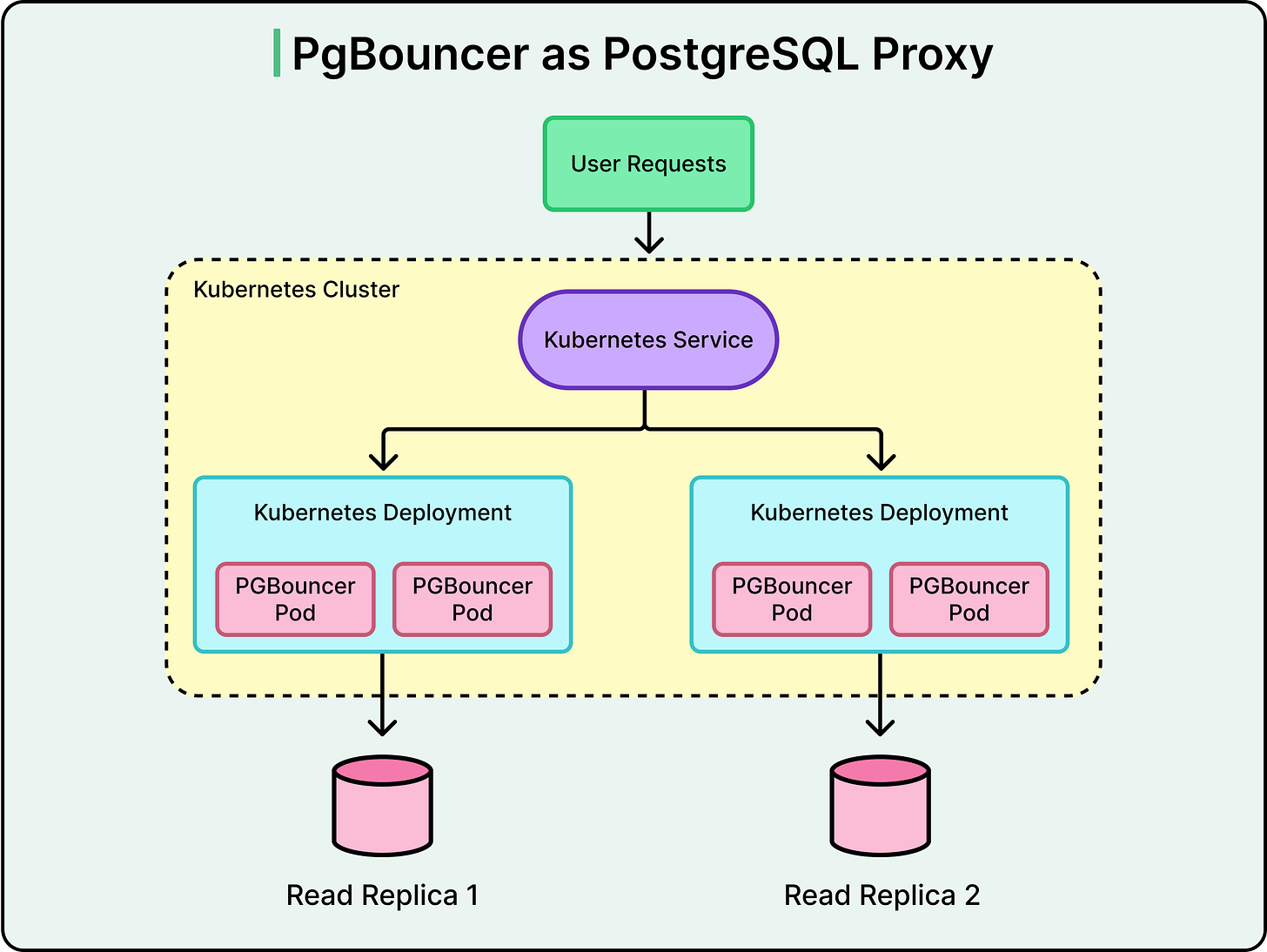 Each read replica has its Kubernetes deployment running multiple PgBouncer pods. Multiple deployments sit behind a single Kubernetes Service that load-balances traffic across pods. OpenAI co-locates the proxy, application clients, and database replicas in the same geographic region to minimize network latency and connection overhead.