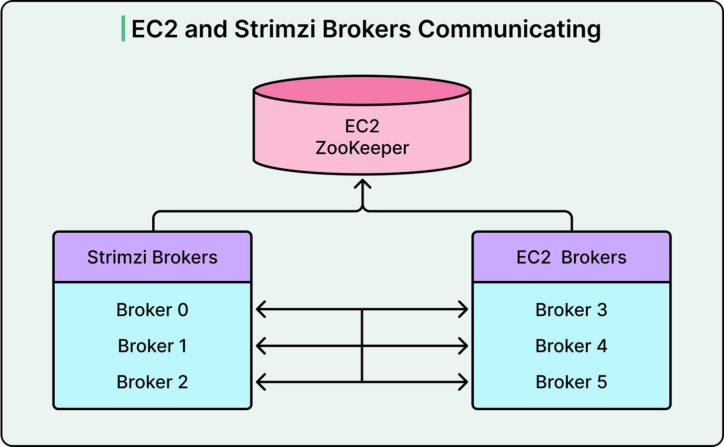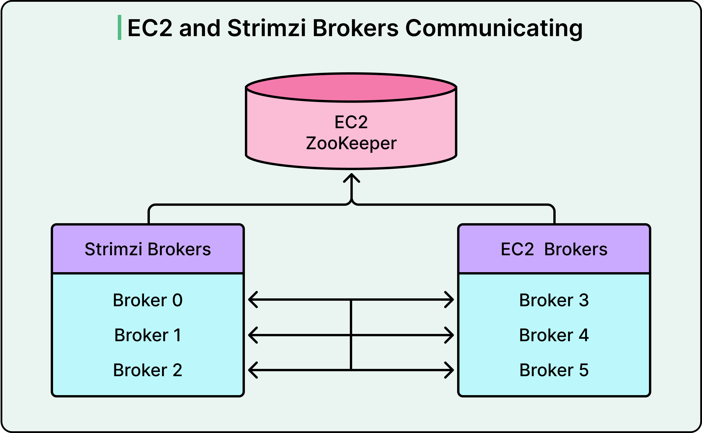 The inter-broker listener configuration was set to use plaintext listeners accessible from both EC2 and Kubernetes, ensuring brokers in different environments could talk to each other.