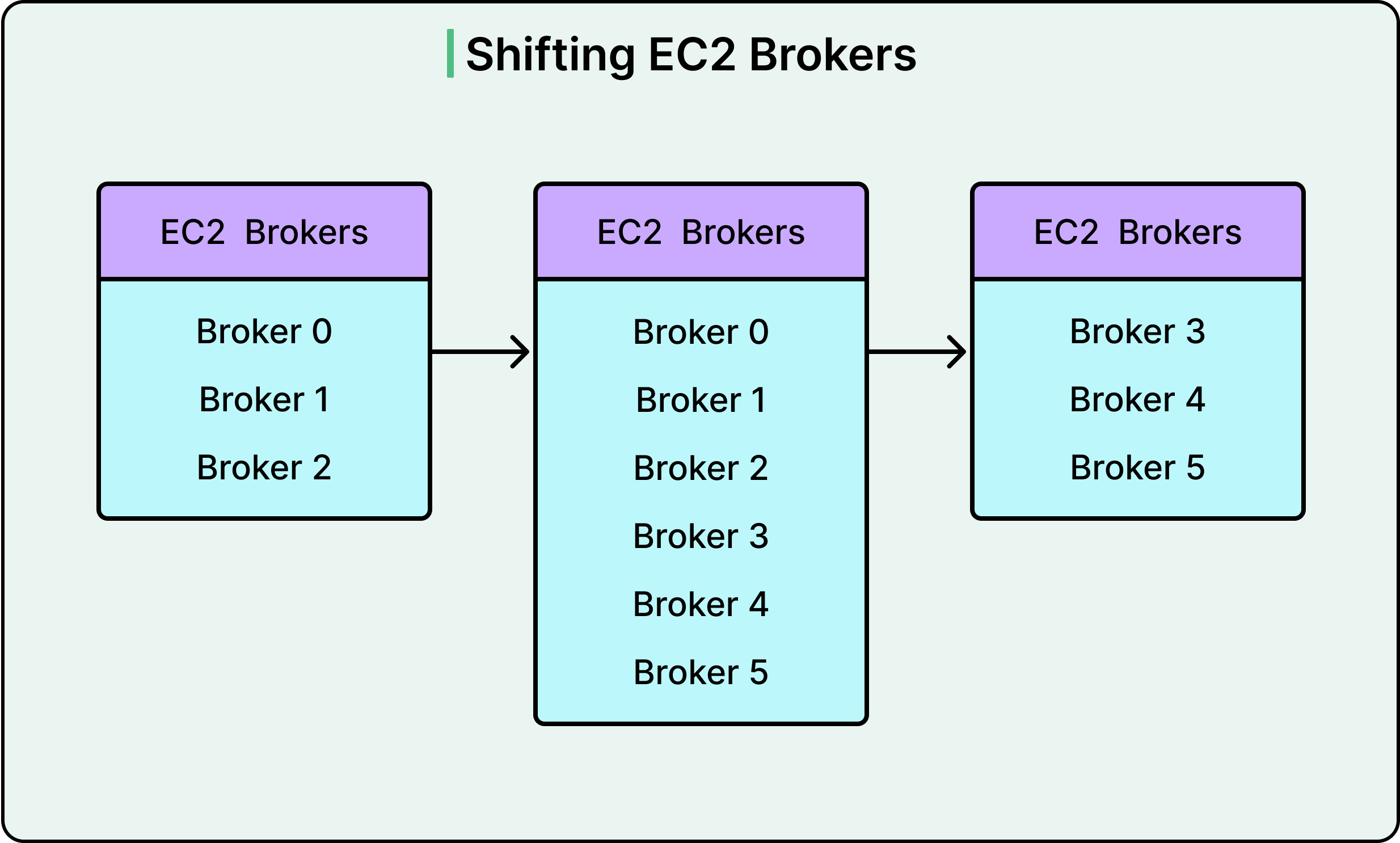 To free up that ID space, Reddit doubled the cluster size by adding new EC2 brokers with higher IDs, then terminated the original low-numbered brokers. This shifted all data onto the higher-numbered brokers and opened up IDs 0, 1, 2, and so on for Strimzi-managed brokers to use.