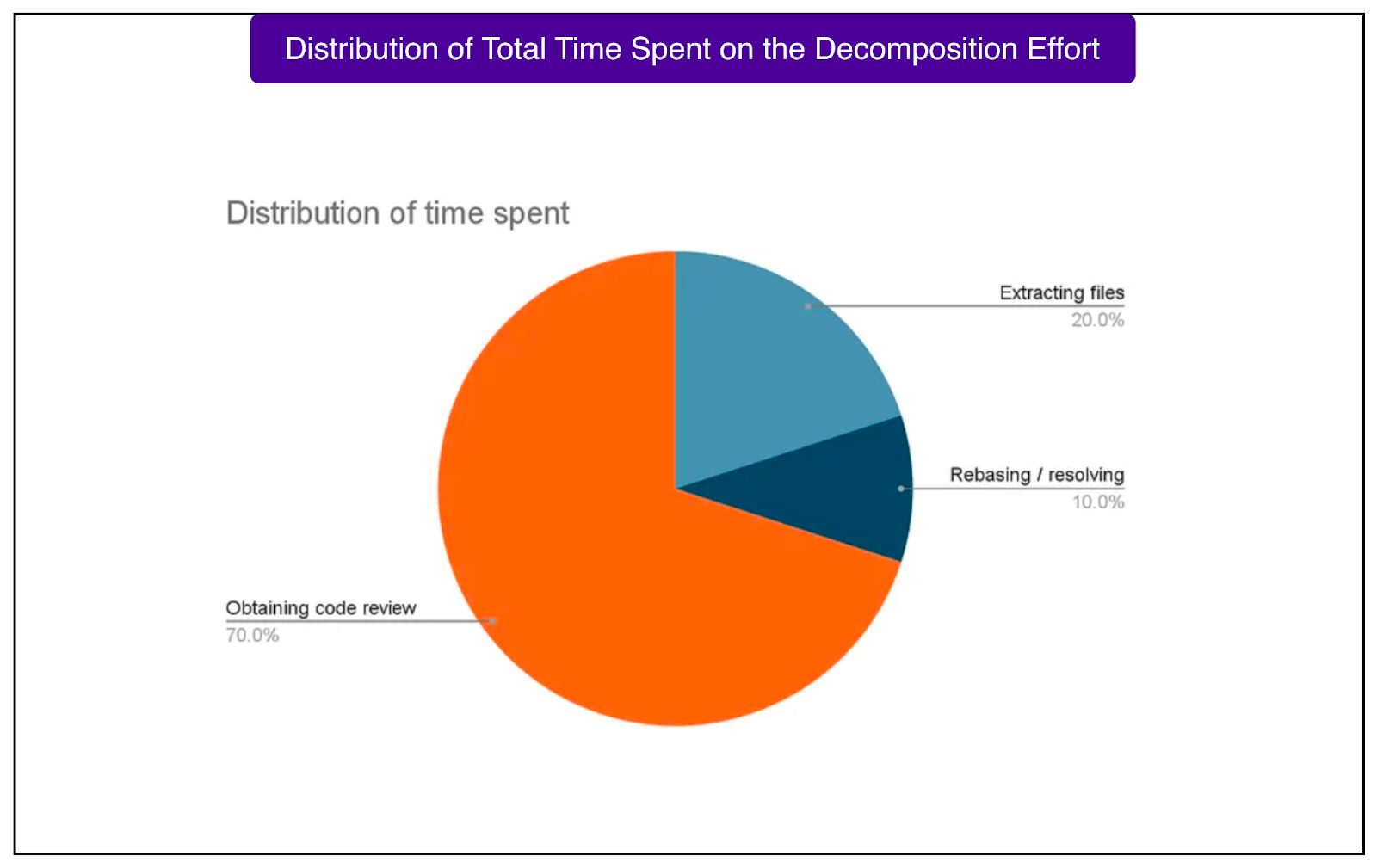 Tinder was able to fully decompose its iOS monolith in less than six months, whereas doing it manually was estimated to take around twelve years. The graph below shows the distribution of time spent on the decomposition effort.