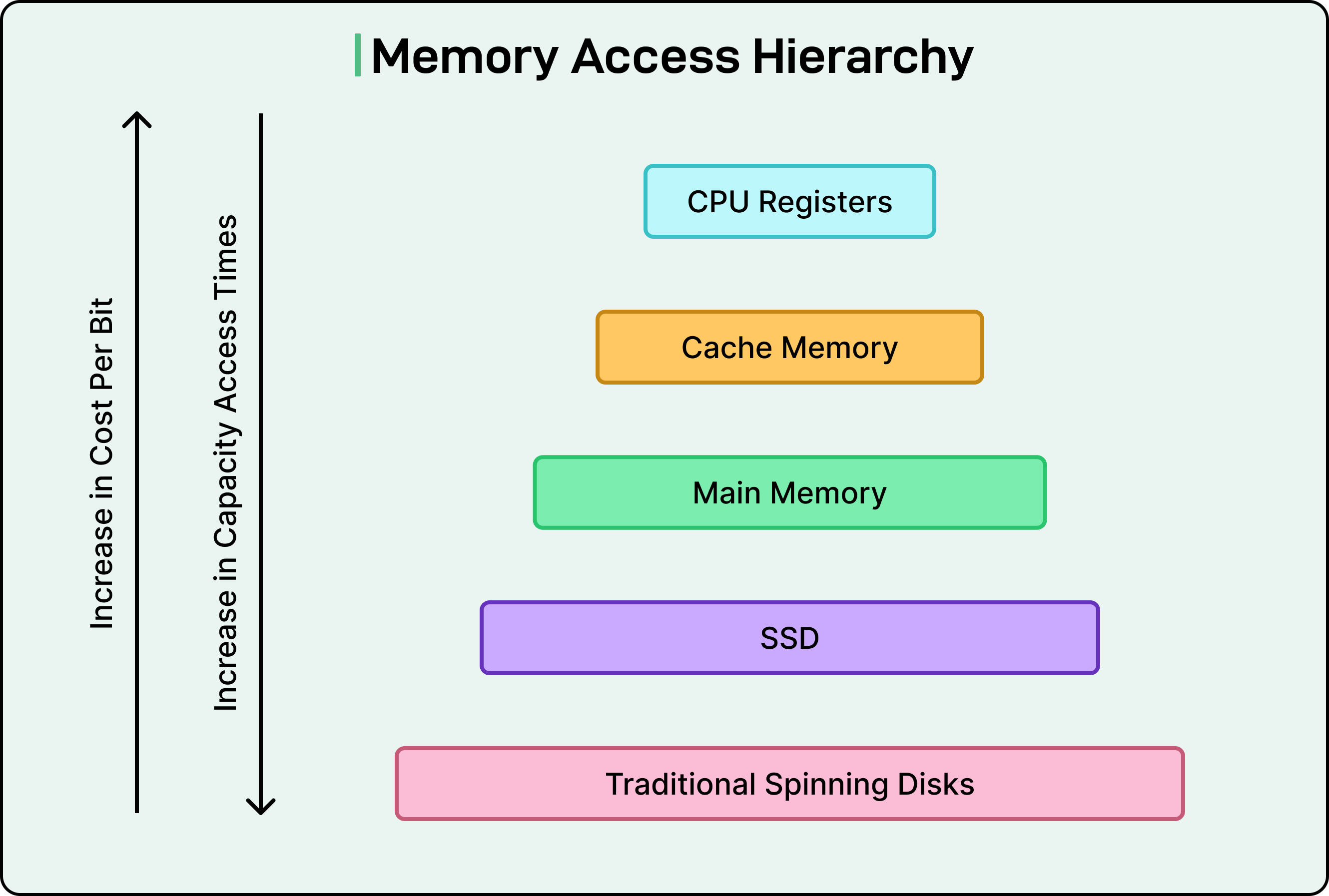 Think of computer operations as existing in different speed tiers. At the fastest tier, we have CPU cache access, which happens in nanoseconds. These are operations where the data is already sitting right next to the processor, ready to be used. One tier slower is accessing main memory (RAM), which takes roughly 100 times longer than cache access. Moving down the hierarchy, reading from an SSD might take 40,000 times longer than a cache access. Network operations take even longer, and traditional spinning disk seeks can be millions of times slower than working with cached data.
