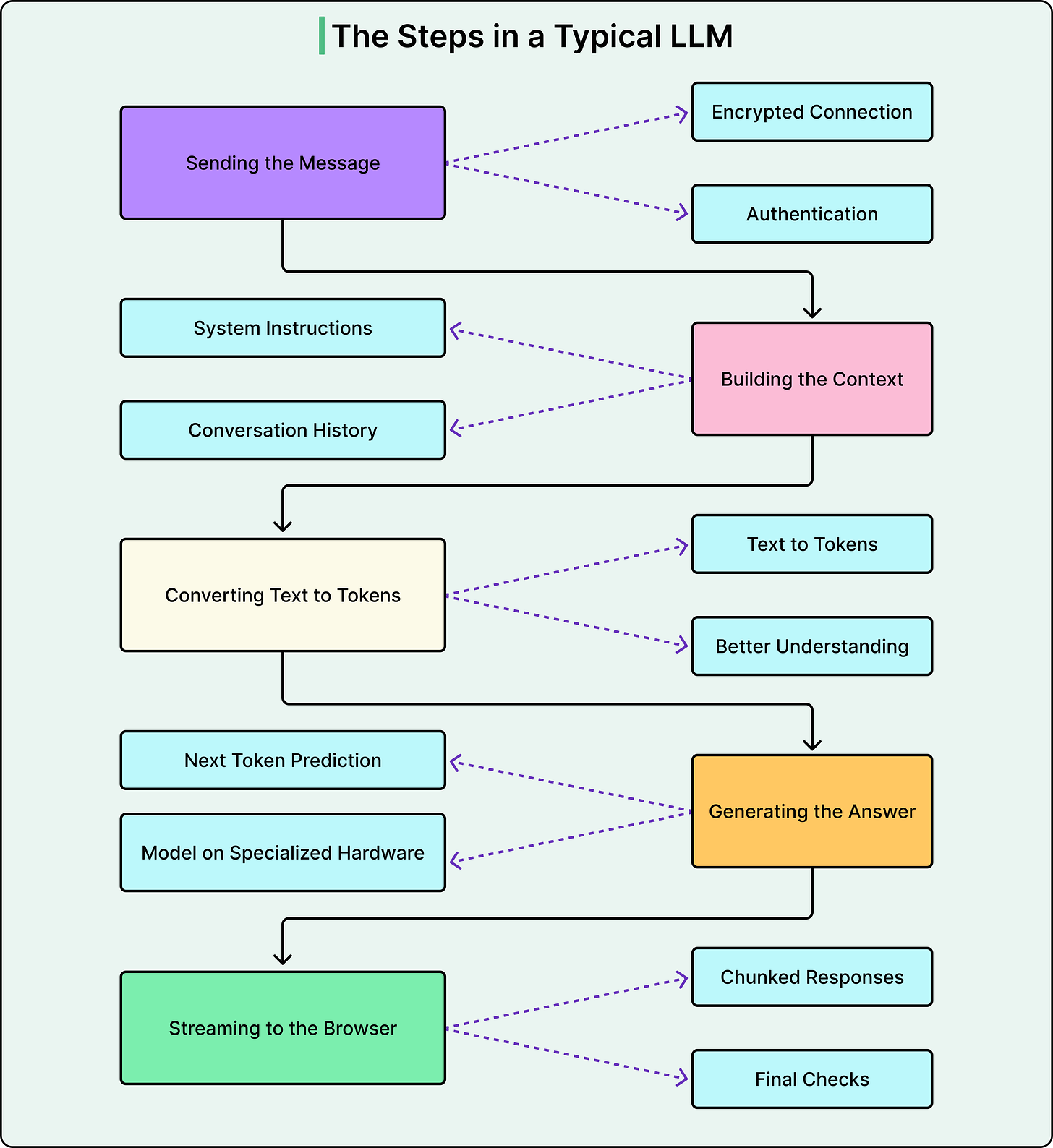 See the diagram below that shows the various steps in an LLM execution flow: