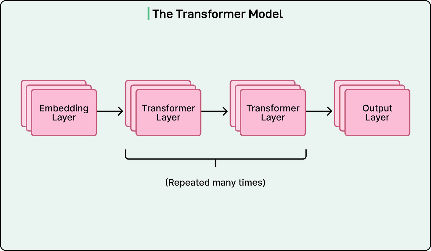 Multiple transformer layers where computation happens.