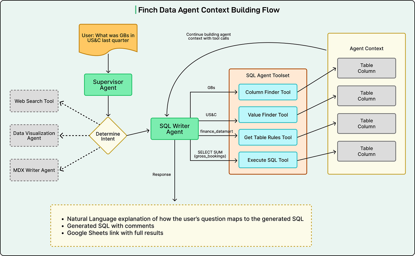 Next, Finch moves into query construction. The SQL Writer Agent uses the metadata to build the correct SQL query against the curated single-table data marts. It ensures that the right filters are applied and the correct data source is used. Once the query is ready, Finch executes it.