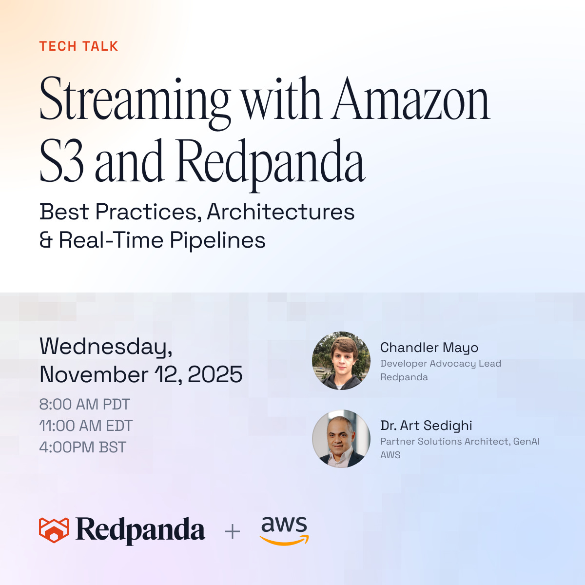 Join us live on November 12 for a Redpanda Tech Talk with AWS experts exploring how to connect streaming and object storage for real-time, scalable data pipelines. Redpanda’s Chandler Mayo and AWS Partner Solutions Architect Dr. Art Sedighi will show how to move data seamlessly between Redpanda Serverless and Amazon S3 — no custom code required. Learn practical patterns for ingesting, exporting, and analyzing data across your streaming and storage layers. Whether you’re building event-driven apps or analytics pipelines, this session will help you optimize for performance, cost, and reliability.