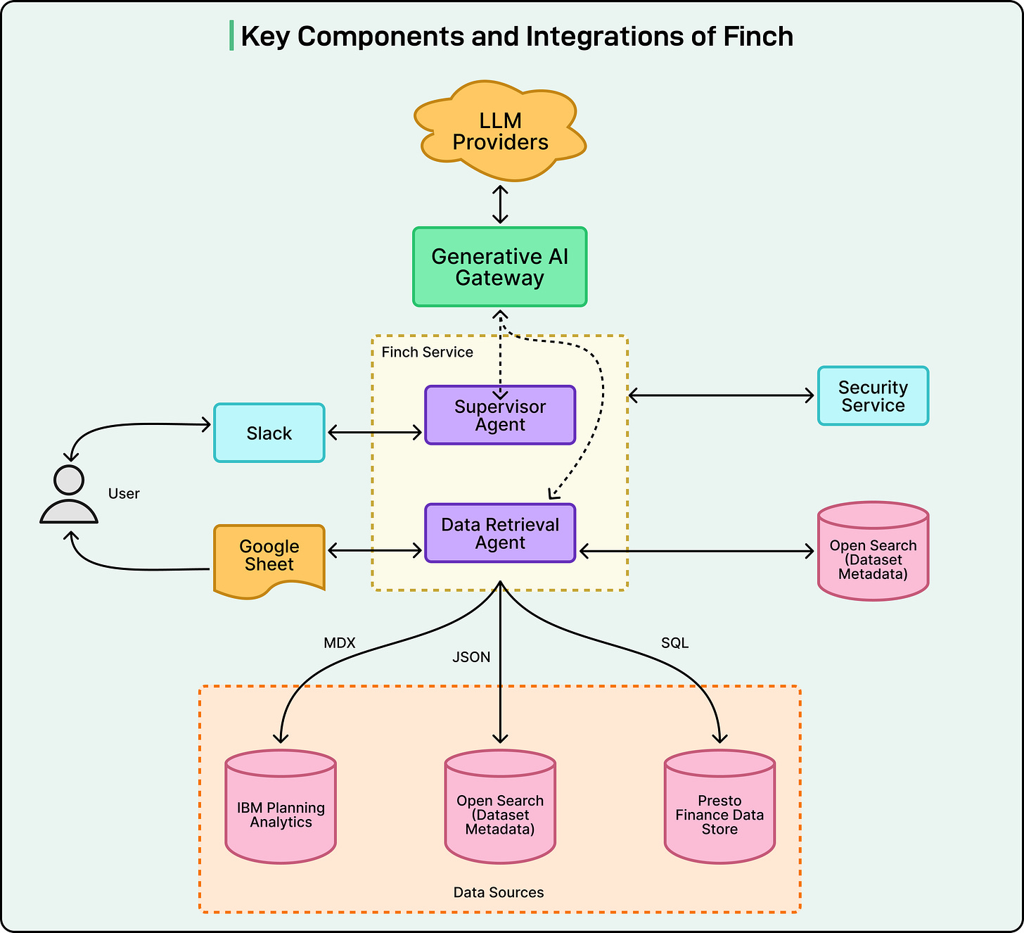 At its core, Finch is designed to make financial data retrieval feel as easy as sending a message to a colleague. When a user types a question, Finch translates the request into a structured SQL query behind the scenes. It identifies the right data source, applies the correct filters, checks user permissions, and retrieves the latest financial data in real time.