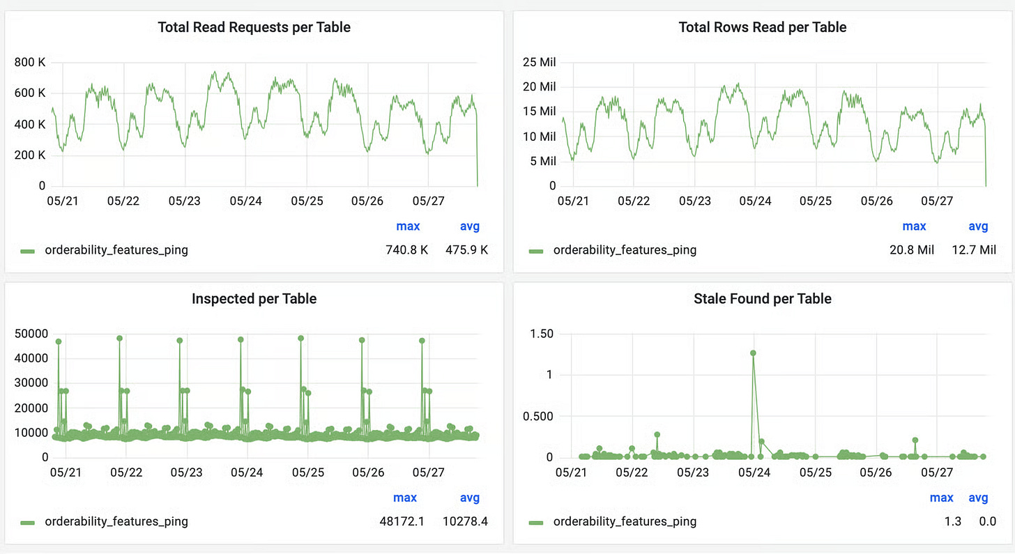 To validate improvements and measure cache consistency, Uber built Cache Inspector. This tool uses the same CDC pipeline as Flux but with a one-minute delay. Instead of invalidating cache, it compares binlog events with what is stored in Redis, tracking metrics like stale entries found and staleness duration.