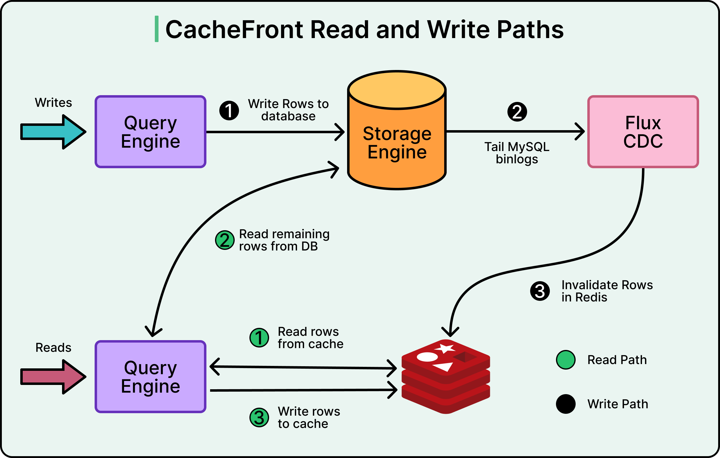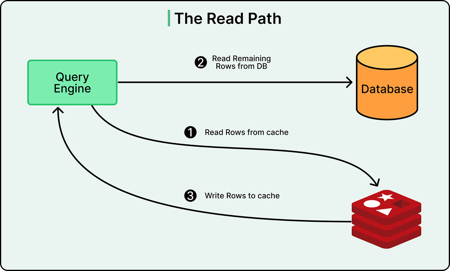 If the data does not exist in Redis, CacheFront fetches it from MySQL, writes it to Redis, and returns the result to the client. The system can handle partial cache misses as well. For example, if a request asks for ten rows and seven exist in cache, it only fetches the missing three from the database.