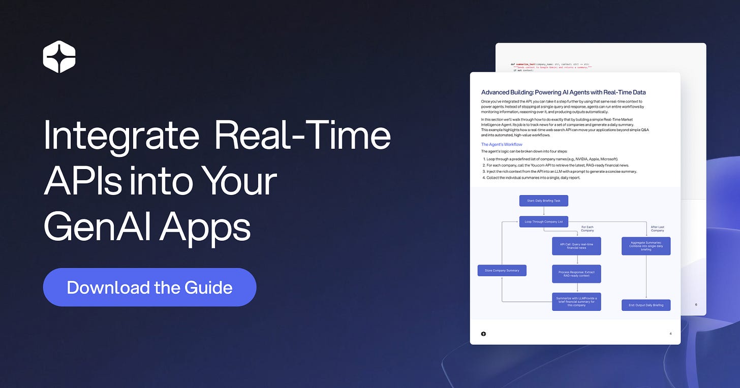 Static training data can’t keep up with fast-changing information, leaving your models to guess. We recommend this technical guide from You.com, which gives developers the code and framework to connect GenAI apps to the live web for accurate, real-time insights.