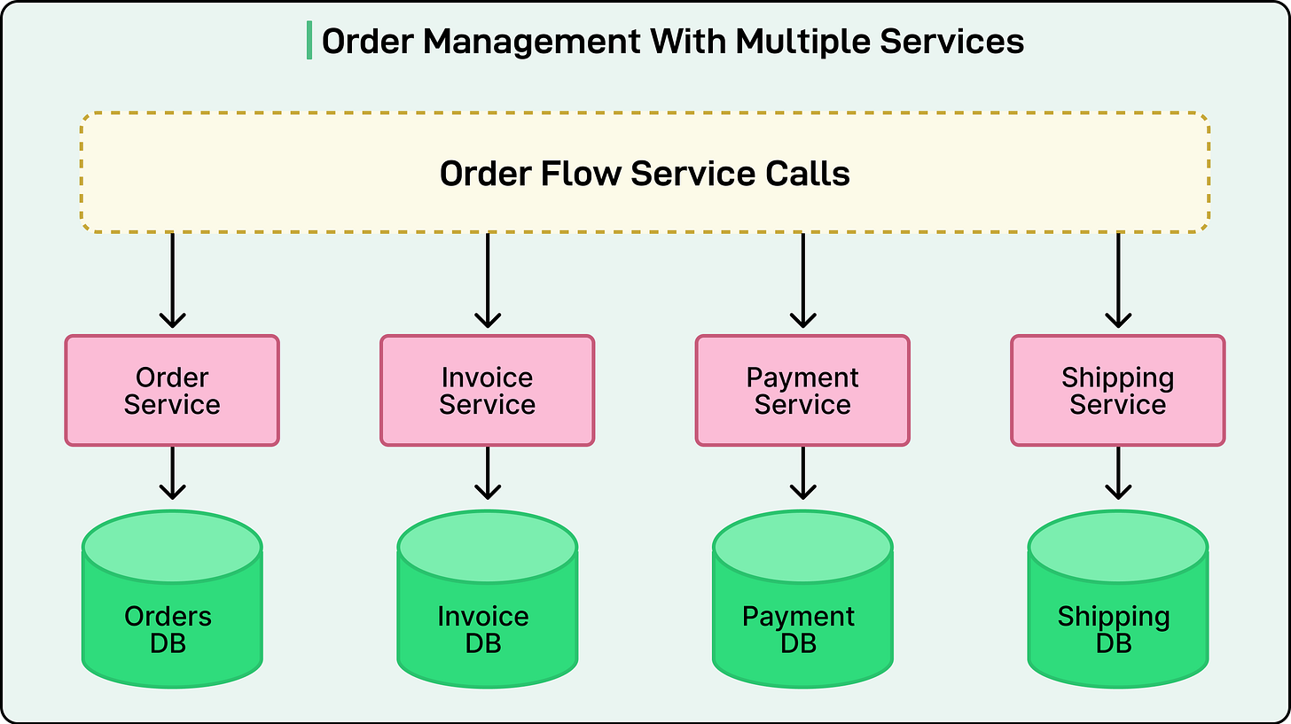 Now imagine a business transaction that spans all these services. Placing an order might require updating the order database, reserving stock in the inventory database, and recording payment details in another database. If one of these steps fails, the system must find a way to keep all services consistent. This is where the problem begins.