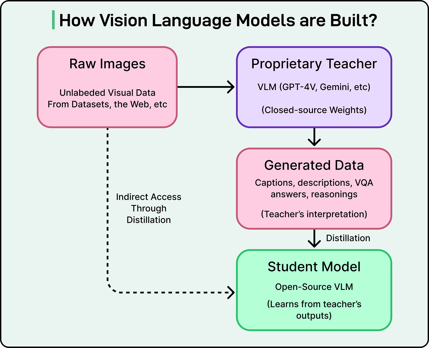 Many open weight VLMs exist today, but most of them rely on a training approach called distillation. In distillation, a smaller student model learns by imitating the outputs of a larger teacher model.