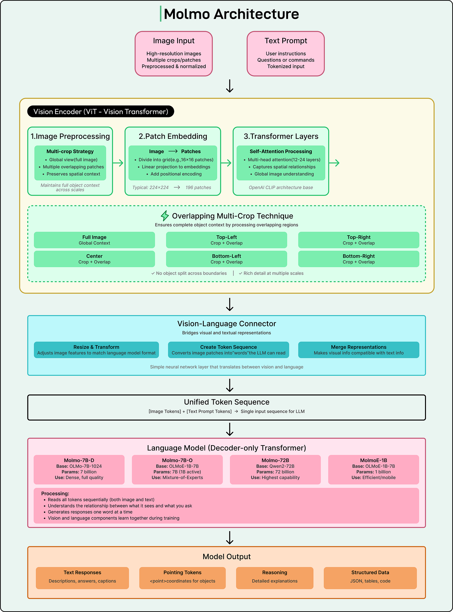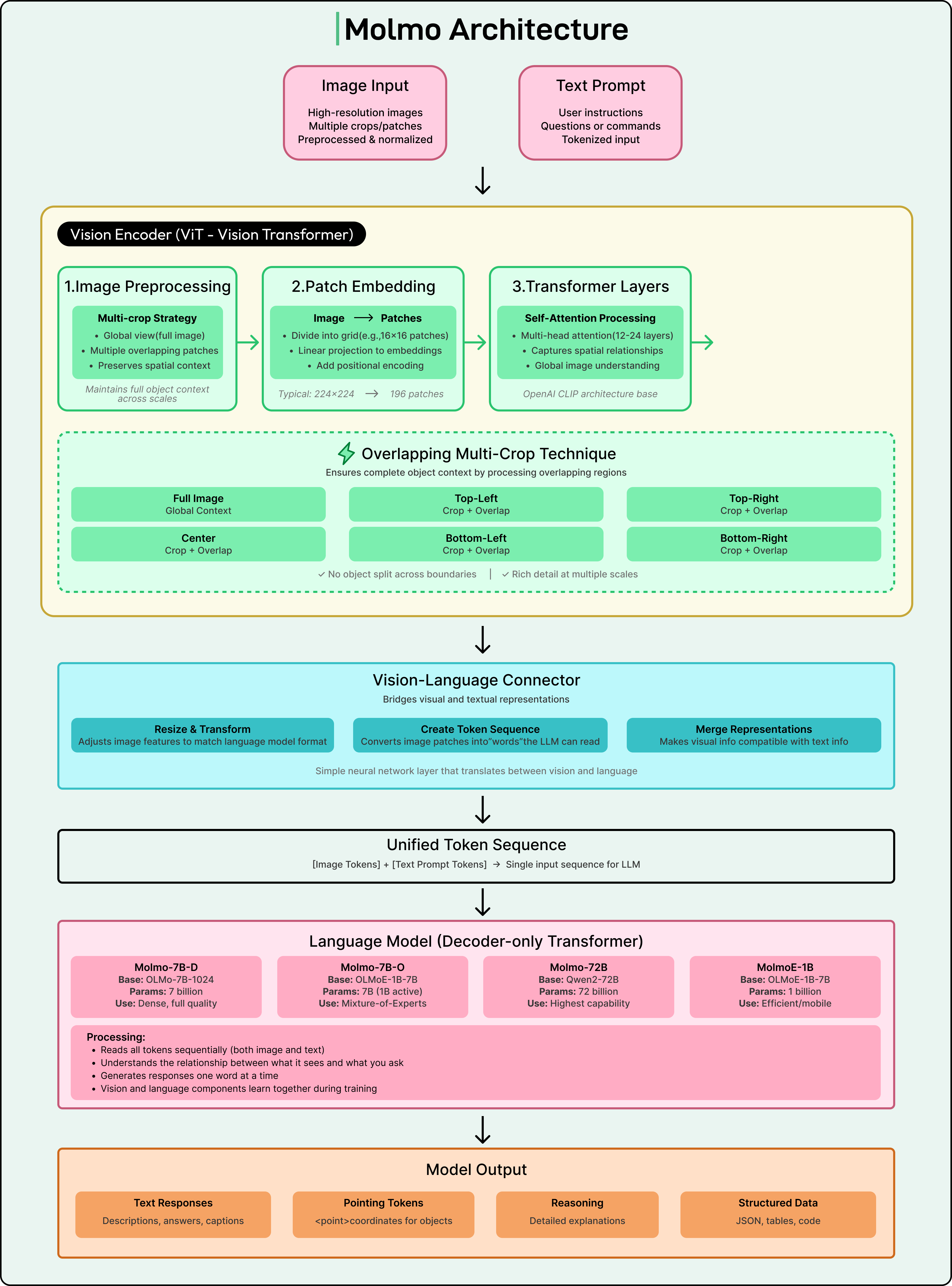 One important idea is the overlapping multi-crop strategy. High-resolution images are too large to be processed at once, so they are split into smaller square crops. This can accidentally cut important objects in half. Molmo solves this by letting the crops overlap so that any object on the border of one crop appears fully in another. This helps the model see complete objects more consistently.