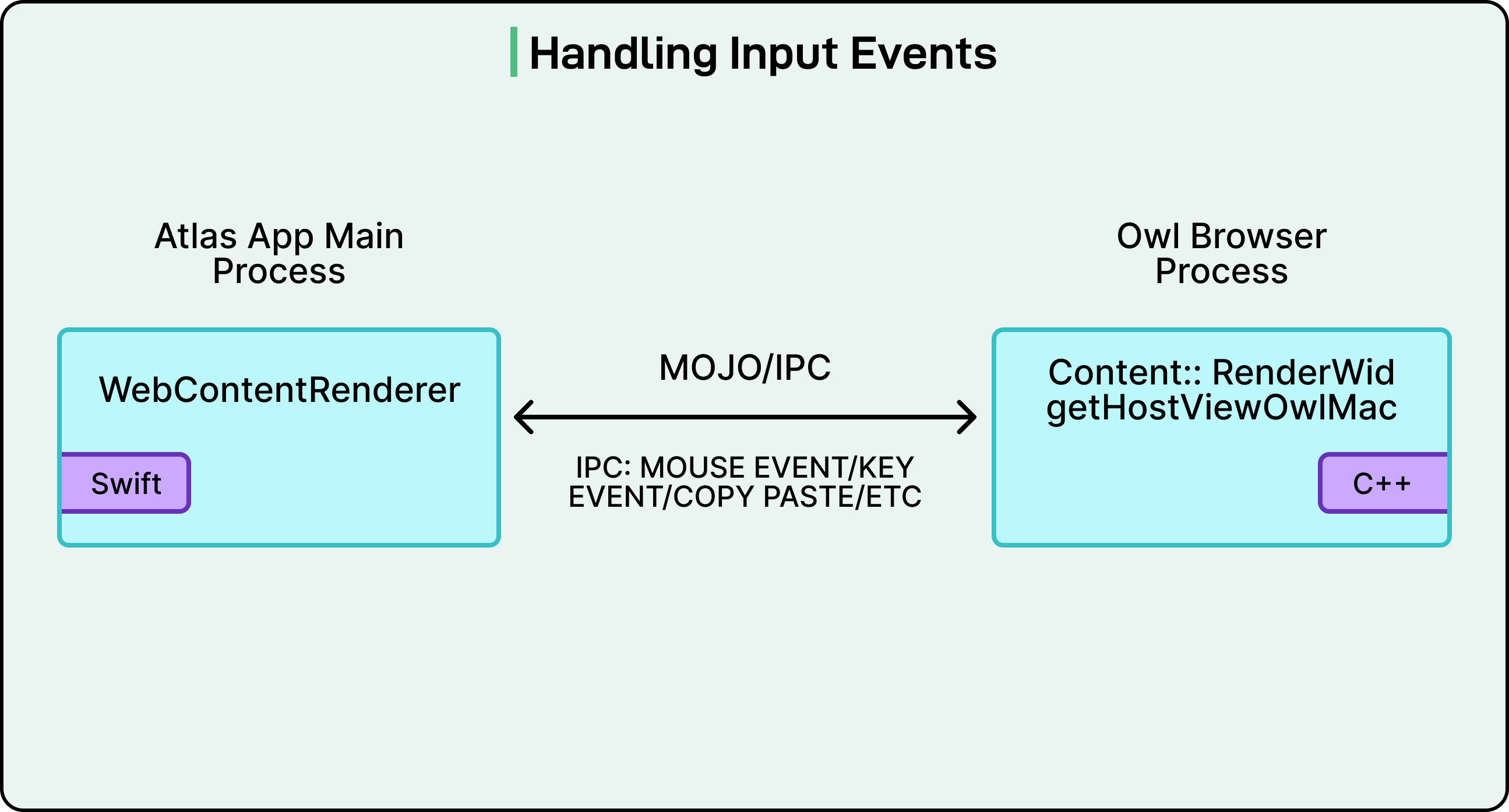 User input requires careful handling across the process boundary. Normally, Chromium’s UI layer translates platform events like mouse clicks or key presses from macOS NSEvents into Blink’s WebInputEvent format before forwarding them to web page renderers.