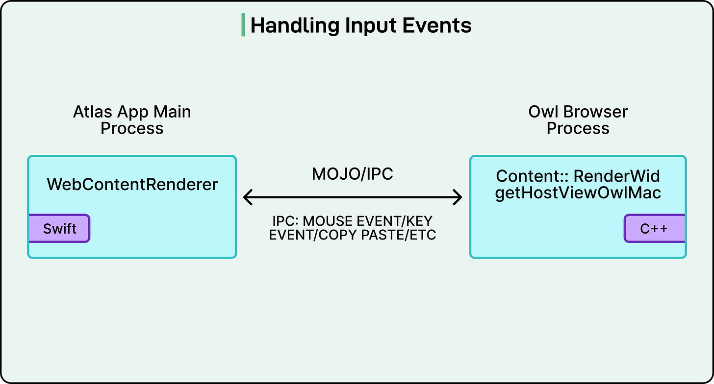 In the OWL architecture, Chromium runs without visible windows, so it never receives these platform events directly. Instead, the Atlas client library performs the translation from NSEvents to WebInputEvents and forwards the already-translated events to Chromium over IPC.