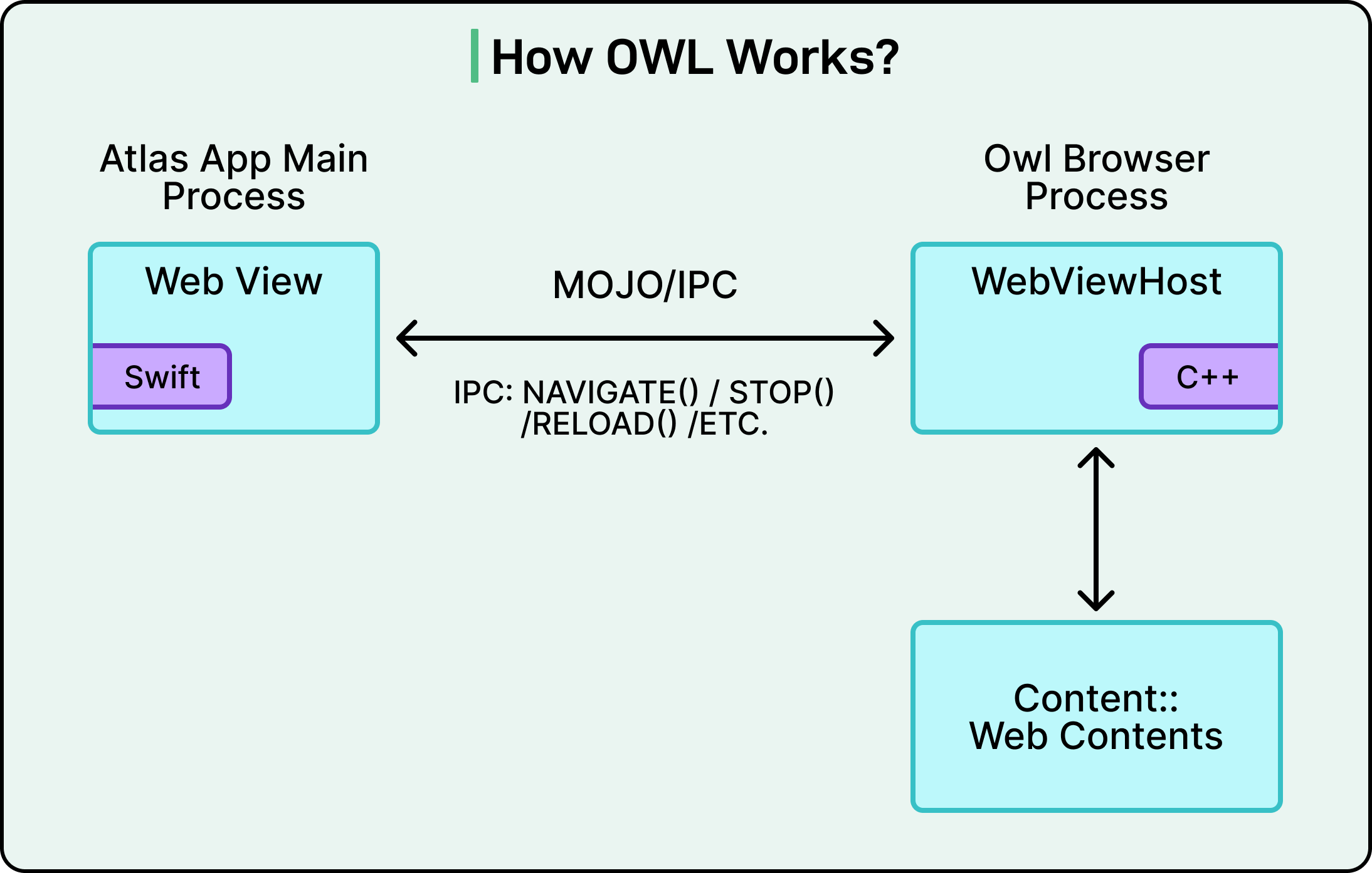 In this architecture, Atlas is the OWL Client, and the Chromium browser process is the OWL Host. These two components communicate through IPC using Mojo, which is Chromium’s own message-passing system. OpenAI wrote custom Swift and TypeScript bindings for Mojo, allowing their Swift-based Atlas application to call Chromium functions directly.