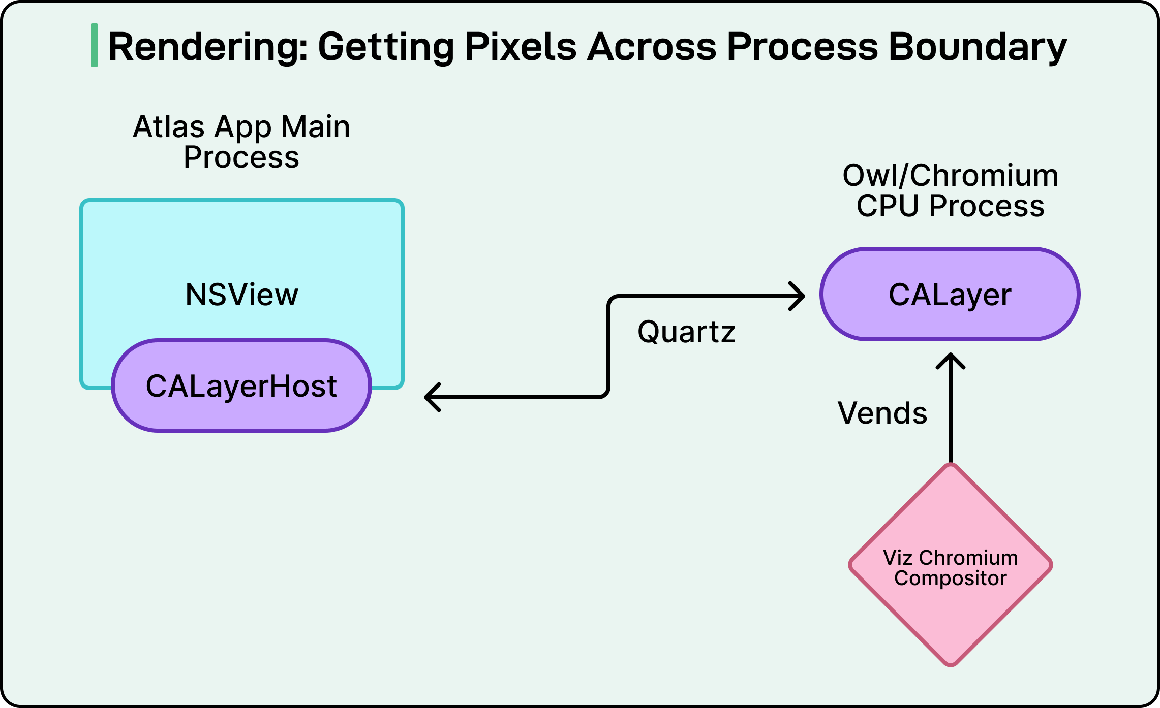 On the Atlas side, an NSView (a window component) embeds this layer using the private CALayerHost API. The context ID tells Atlas which layer to display.