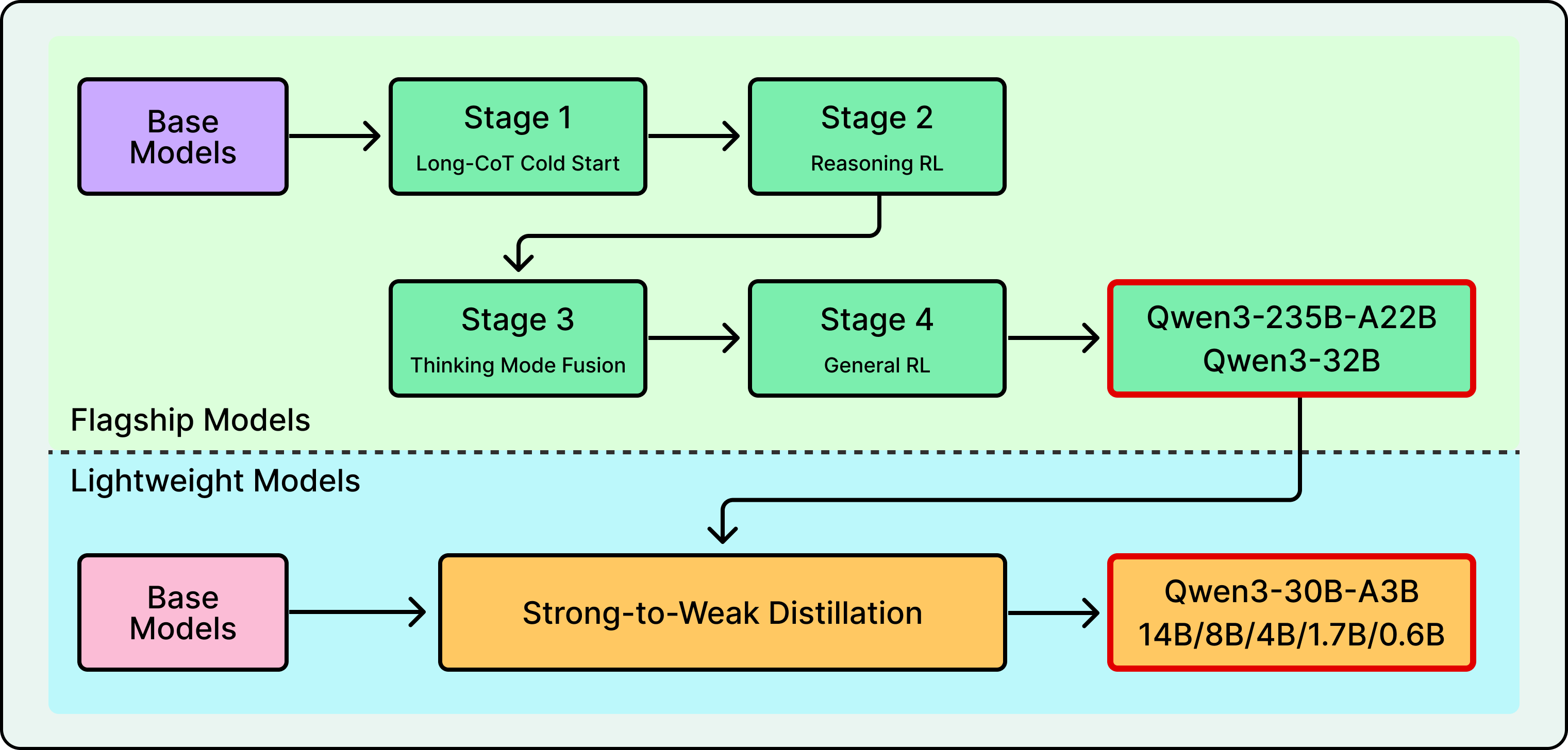 Distillation from a larger teacher trains a massive model and uses its outputs to teach smaller ones. Llama 4 co-distilled from Behemoth, a 2-trillion-parameter teacher model, during pre-training itself. Qwen3 distills from its flagship down to smaller models in the family.
