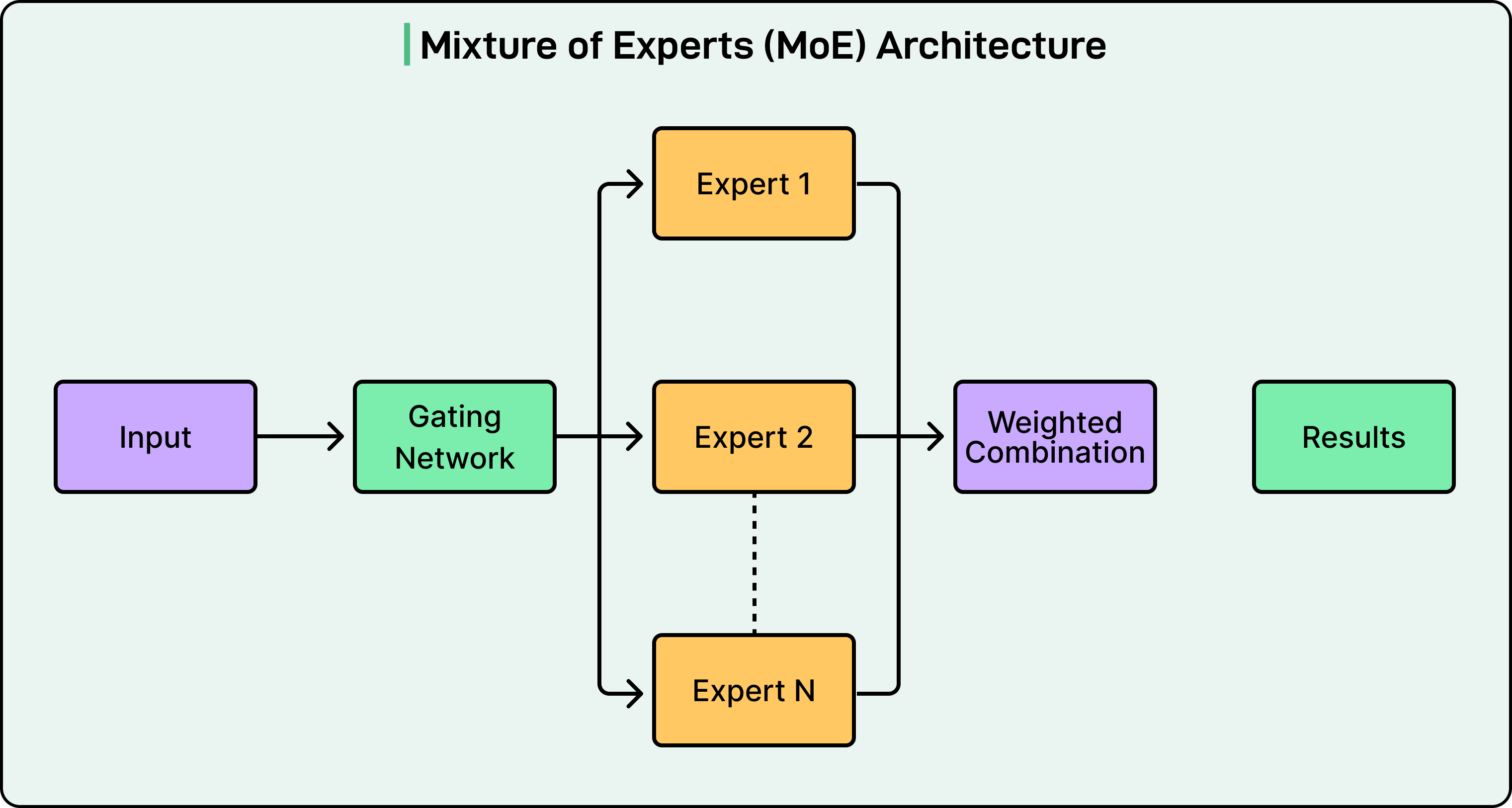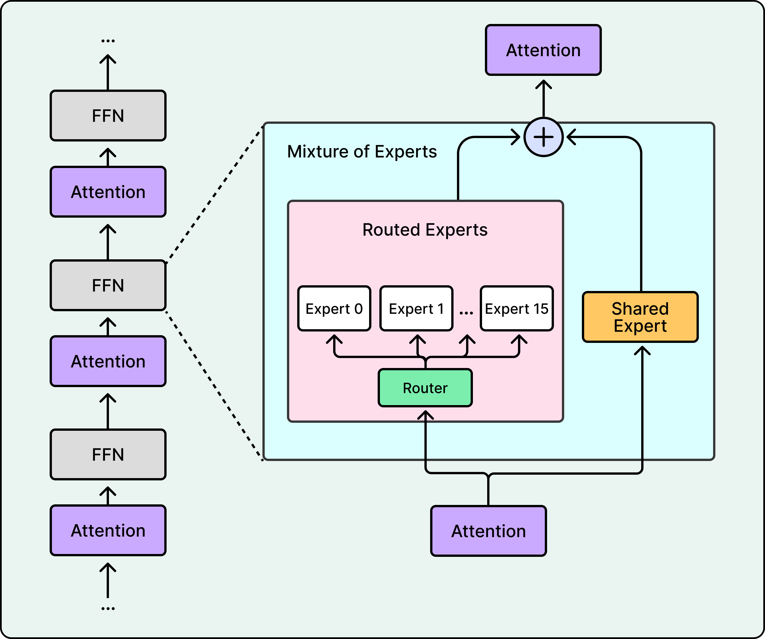 MoE solves this by replacing the monolithic feed-forward layer in each transformer block with multiple smaller “expert” networks and a learned router that decides which experts handle each token. This result is a model that can, for example, store the knowledge of 671 billion parameters but only compute 37 billion per token.
