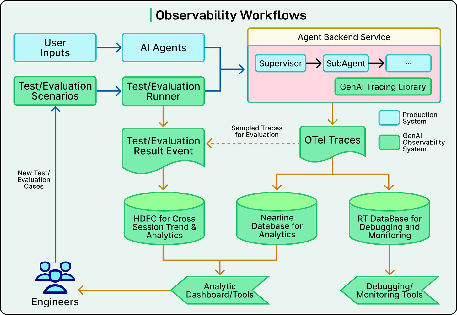 See the diagram below that shows the observability workflows for LinkedIn’s agentic systems.