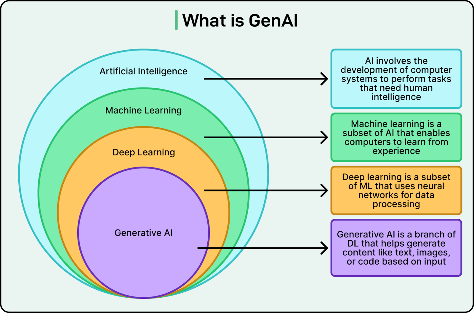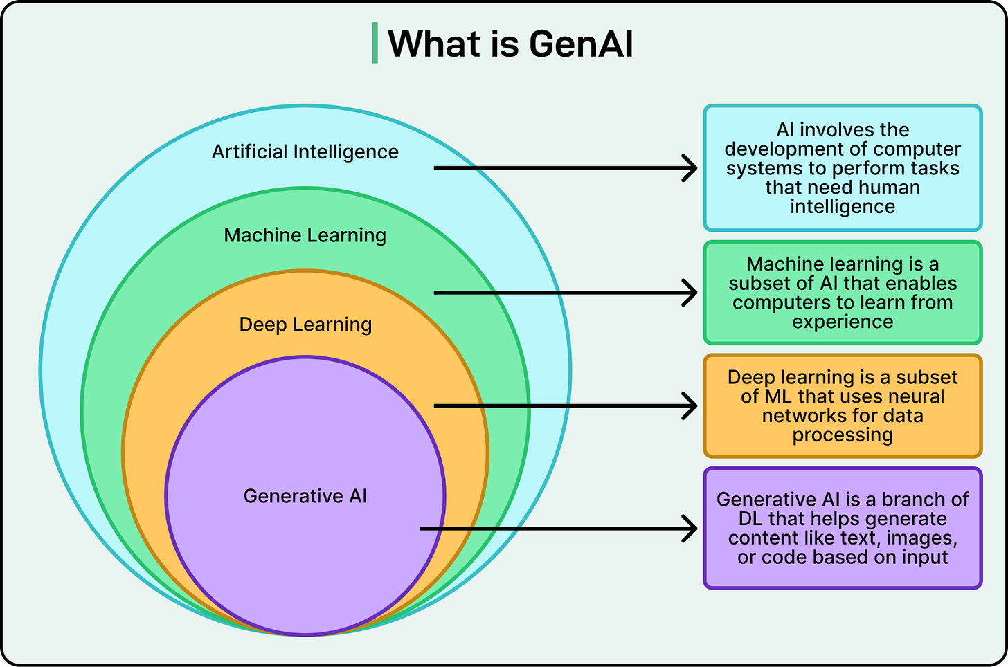 During 2023 and 2024, LinkedIn focused on creating a unified GenAI application stack that could support fast experimentation while remaining stable and scalable. GenAI is a branch of Deep Learning that helps generate content like text, images, or code based on input. The diagram below shows how it relates to other areas like AI and Machine Learning.