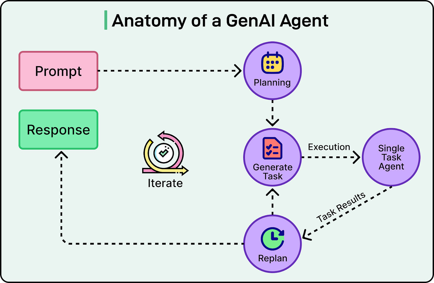 See the diagram below that shows the anatomy of a GenAI agent.
