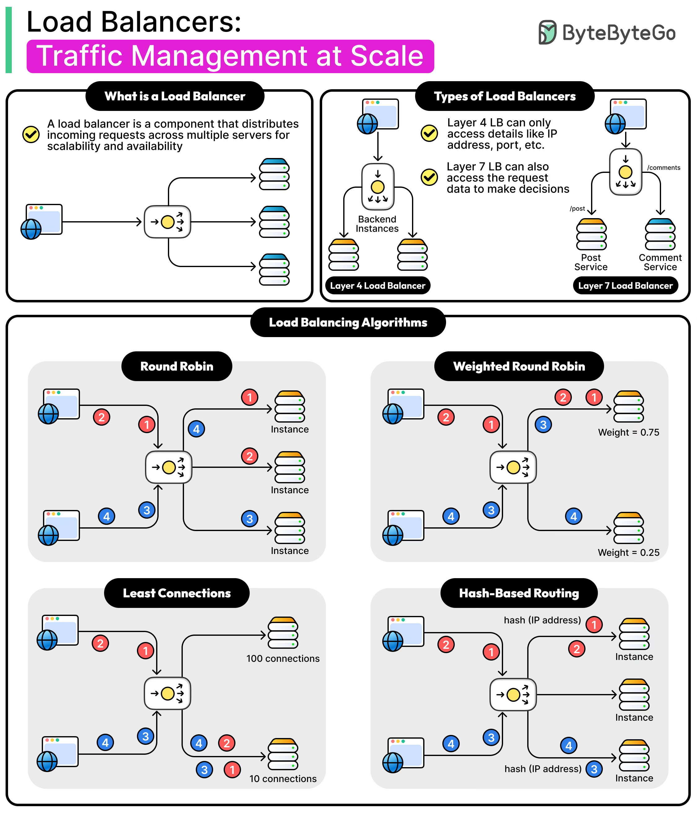 In this article, we will learn how load balancers work internally, the differences between load balancing at the transport and application layers, and the common algorithms that power traffic distribution in real-world systems.