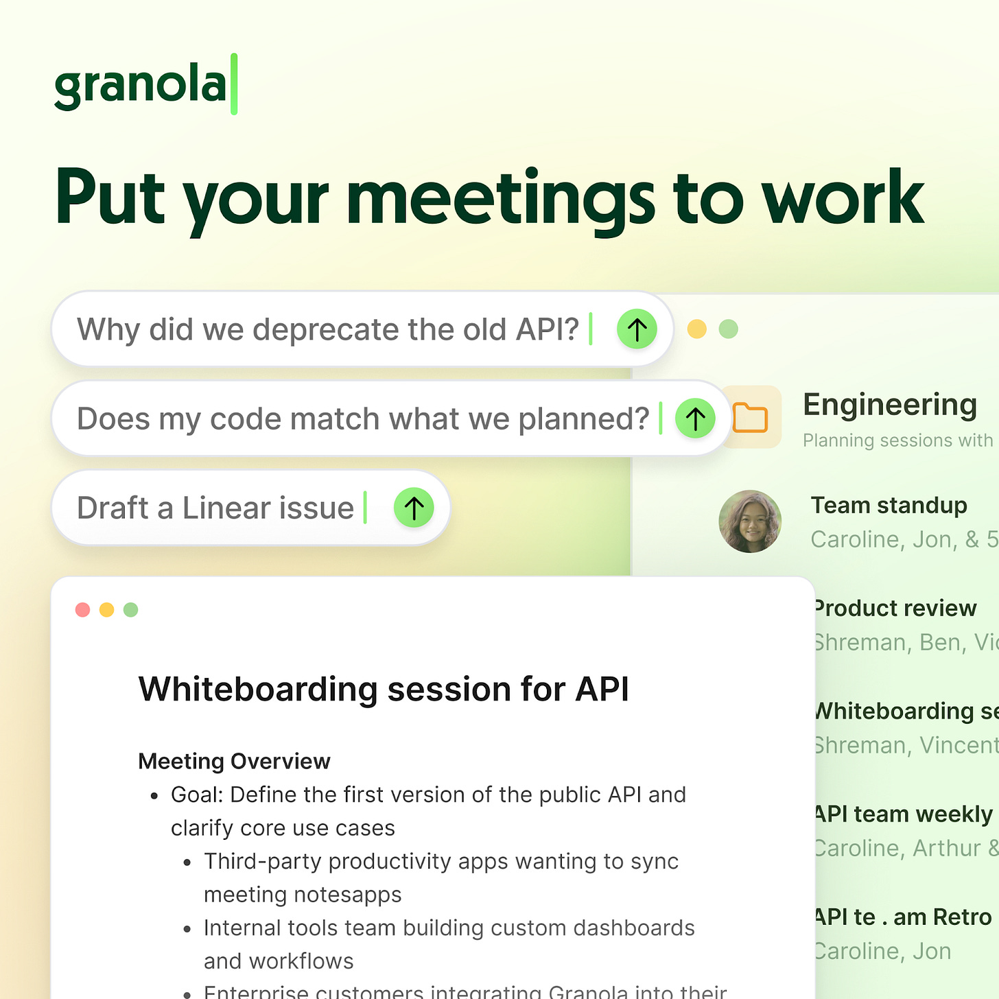 Granola works with your device audio, so no bots join your meetings. Use with any meeting app, like Zoom, Meet or Teams, and in-person with Granola for iPhone.
