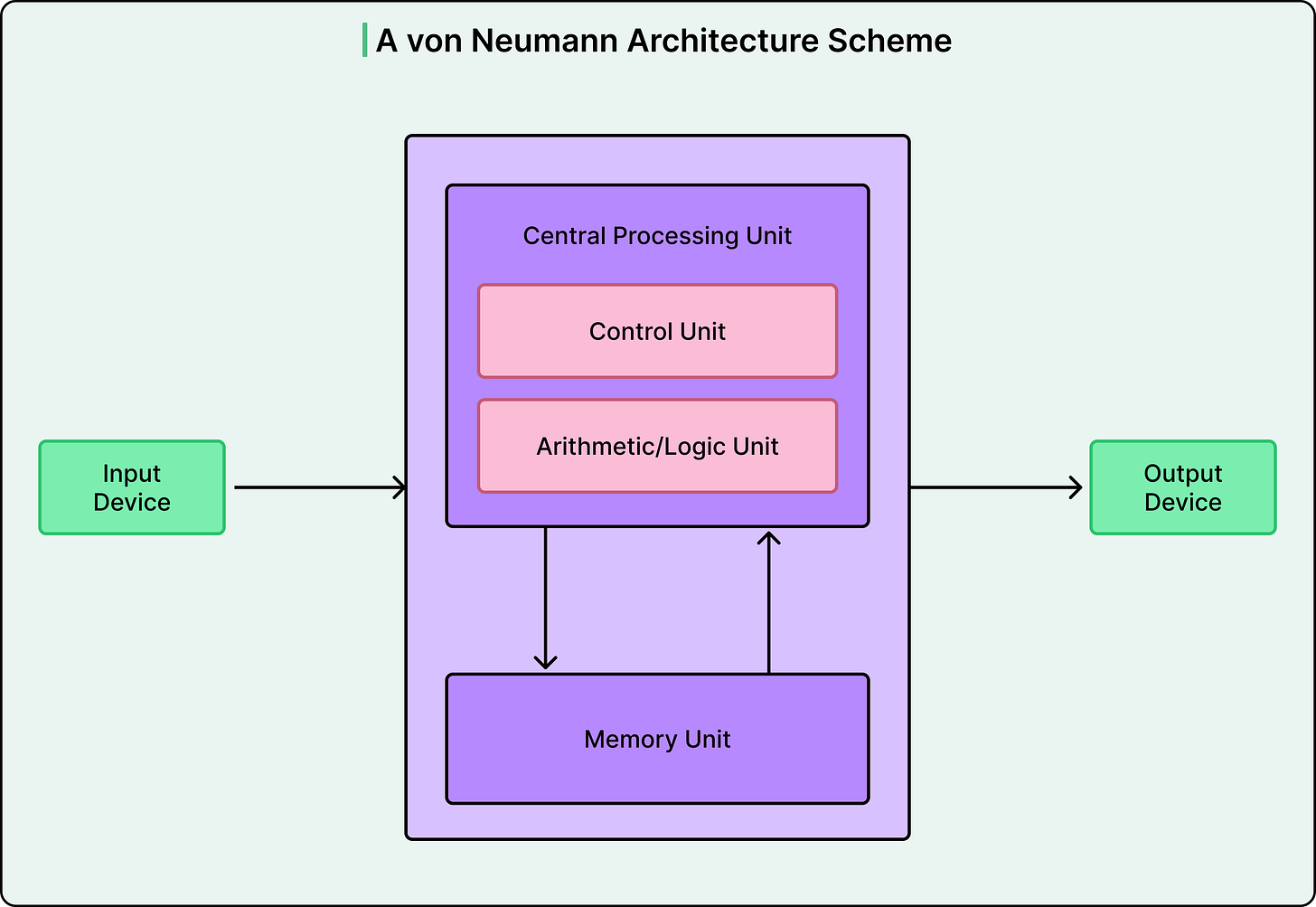 Traditional computers follow the Von Neumann architecture, where a processor and memory communicate through a shared bus. To perform any calculation, the CPU must fetch an instruction, retrieve data from memory, execute the operation, and write results back. This constant transfer of information between the processor and memory creates what computer scientists call the Von Neumann bottleneck.